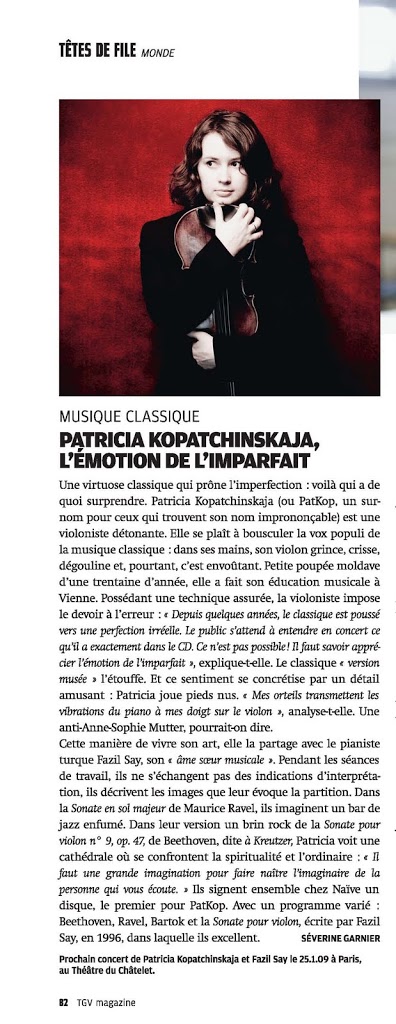 1. […] L’émotion de l’imparfait La soliste invitée du concert bordelais du Chamber Orchestra of Europe est un bijou d’énergie. Patricia Kopatchinskaia (elle nous autorise à l’appeler « PatKop ») est une violoniste passionnée et virtuose. Petite poupée moldave joufflue de quarante ans, elle a fait son éducation musicale à Vienne, autant dire à la Mecque du classique. Pour autant, elle aime bousculer les codes du classique en privilégiant l’échange et l’émotion à la perfection technique des singes savants du violon. Si elle joue les pieds nus, c’est pour mieux sentir les vibrations de la musique. A ceux qui s’attendent à trouver au concert la même perfection qu’au disque, elle répond par cette belle formule : « Il faut savoir apprécier l’émotion de l’imparfait. » […]