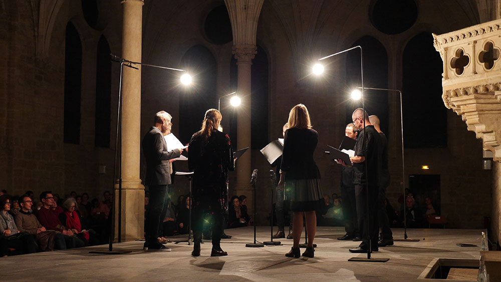 Le décor est minimaliste, éclairé par de simples lumières tamisées. Graindelavoix est installé dans une disposition circulaire, caractéristique des ensembles a cappella. Ce cadre simple et efficace ne fait que renforcer les envolées célestes et les voix souterraines.