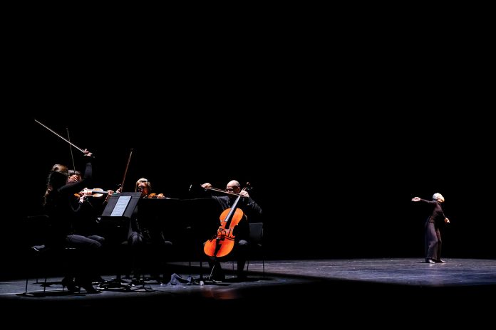 Pour l’exécution du Pierrot Lunaire, les solistes de l’Ensemble intercontemporain se sont regroupés côté jardin de la scène autour de la mezzo-soprano Salomé Haller, tandis que le côté cour se trouvait entièrement consacré à la danse. Dans une demi pénombre persistante et presque oppressante, éclairée plus radicalement à certains moments-clés de faisceaux de couleurs blanche ou rouge sang, selon le poème décliné par la récitante, Saburo Teshigawara a réglé une chorégraphie à la fois savante et épurée. Seul ou en duo avec sa partenaire en danse Rihoko Sato, il a cherché à créer un vocabulaire gestuel répondant aux exigences propres au Sprechgesang, forme d’écriture vocale inédite initié par Schönberg, entre parlé et chanté.