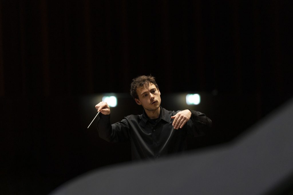 Lorsque Till et Gradlon franchissent les portes du couvent des Jacobins à Rennes, une atmosphère particulière les attend. La salle, baignée dans une lumière tamisée pouvant évoquer les sous-bois, est animée par le bavardage incessant du public impatient etl’orchestre déjà présent sur scène, s’échauffant dans une joyeuse cacophonie. Quel milieu hostile pour nos deux invités habitués à la sérénité de leur forêt ! Heureusement, l’arrivée du chef d’orchestre Nicolas Ellis rétablit rapidement l’ordre, et le silence s’installe aussitôt. Tousser devient même interdit : le chef reportera le départ de l’oiseau de feu à deux reprises, visiblement agacé et s’adressant avec un humour sarcastique aux fauteurs de trouble.